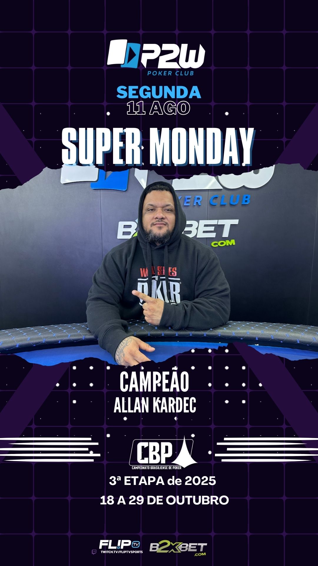 Com uma estrutura dinâmica e um field afiado, o torneio foi palco de grandes jogadas, reviravoltas e uma mesa final de altíssimo nível. Após horas de disputa intensa, quem levou a melhor e garantiu o título do Super Monday foi o jogador Allan Kardec, que mostrou consistência e frieza nos momentos decisivos.