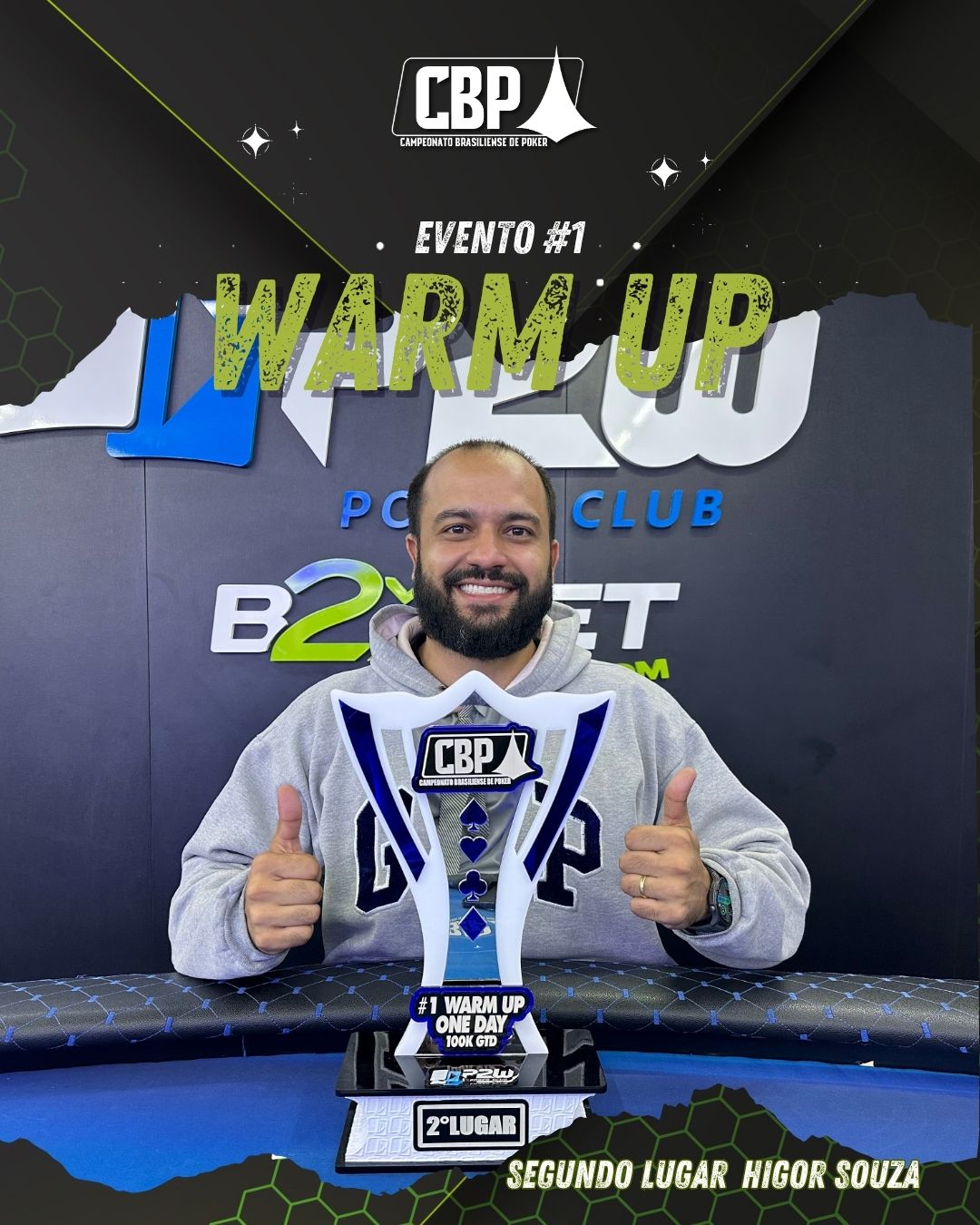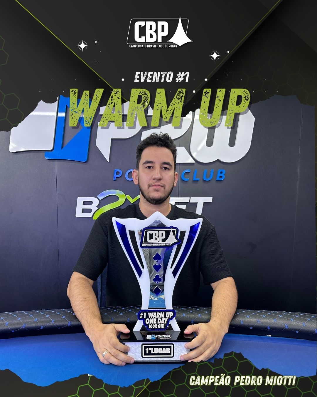 Quem brilhou e puxou o primeiro troféu da etapa foi o jogador PEDRO MIOTTI, que mostrou sangue frio e muita habilidade em uma mesa final duríssima, repleta de nomes fortes do cenário local. Em um field onde qualquer erro significava a eliminação, PEDRO chegou a ficar com 1 blind, mas teve paciência e soube administrar a pressão levou o título com mérito.