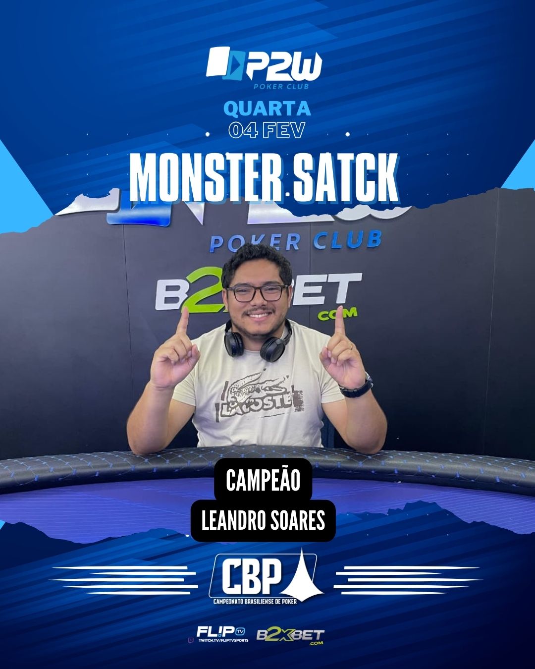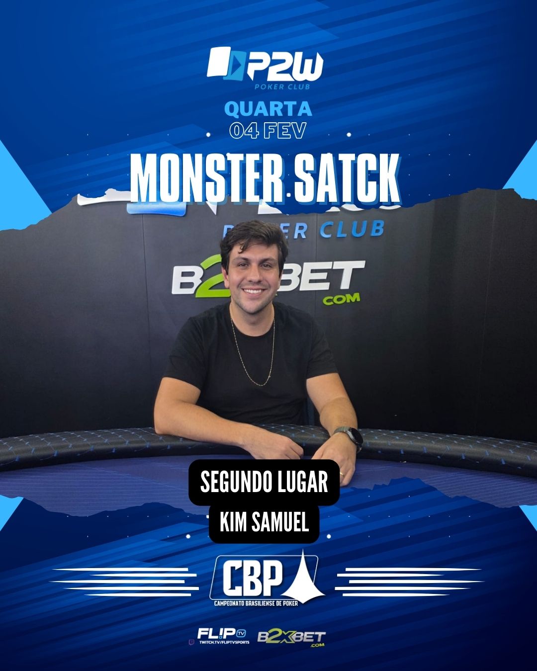 Neste início de fevereiro, a média se manteve alta. Foram mais de 60 entradas e um pote de R$ 8.360,00. Mais um sucesso pra conta! E quem levou a melhor dessa vez foi o jogador LEANDRO SOARES. Ele mandou muito bem na mesa final e mereceu o título. KIM SAMUEL ficou com o vice-campeonato e vem mostrando regularidade. FERNANDO MACIEL ficou em terceiro, completando o pódio e chegando mais uma vez nos eventos da P2W.