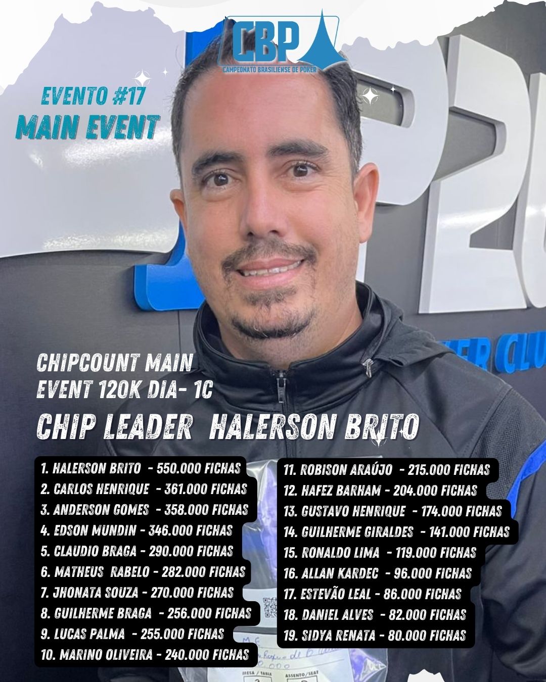 Em meio a esse cenário de alta competitividade, quem brilhou e puxou a fila foi o jogador Halerson Brito, que apresentou um desempenho dominante e encerrou o dia com impressionantes 550.000 fichas, assumindo a liderança do Dia 1C e se colocando como um dos grandes nomes na briga pelo título.