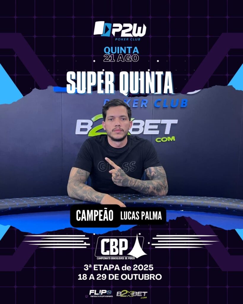 MAIS UMA NOITE DE CASA CHEIA E GARANTIDO BATIDO JOSE MARTINS agosto 22, 2025 SUPER QUINTA DÁ SHOW E TEM LUCAS PALMA COMO GRANDE CAMPEÃO Essa semana está espetacular aqui na P2W. Nossos torneios estão lotados e os garantidos sendo ultrapassados facilmente. Em outra noite de festa, tivemos o torneio Super Quinta, que contou com […]