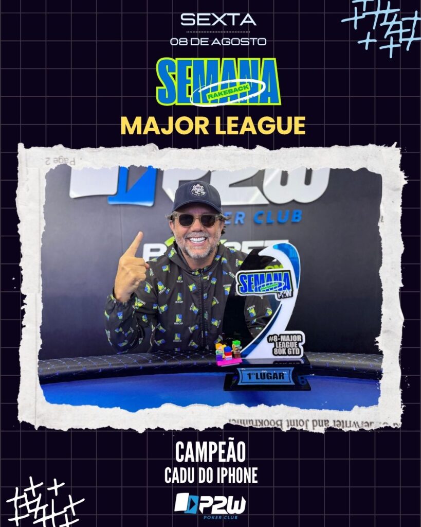 SEMANA RAKEBACK – EVENTOS #8 MAJOR LEAGUE JOSE MARTINS agosto 9, 2025 MAJOR LEAGUE FAZ A FESTA NO SALÃO DA P2W E CONSAGRA CADU DO IPHONE COMO CAMPEÃO A Sexta-feira foi histórica na Semana Rakeback da P2W! O nosso salão recebeu 105 jogadores no pano para disputar o aguardado Major League, evento principal da semana, […]